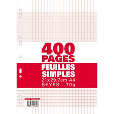 Feuillles simples perforées es un paquete de hojas con agujeros, mirad bien si piden con «grand carreaux» que será como el de la foto o si piden «double» que son las que vienen de dos en dos (como si fueran un libro). Si te dicen «Feuilles mobiles» son hojas simples.Aquí os dejo una foto: